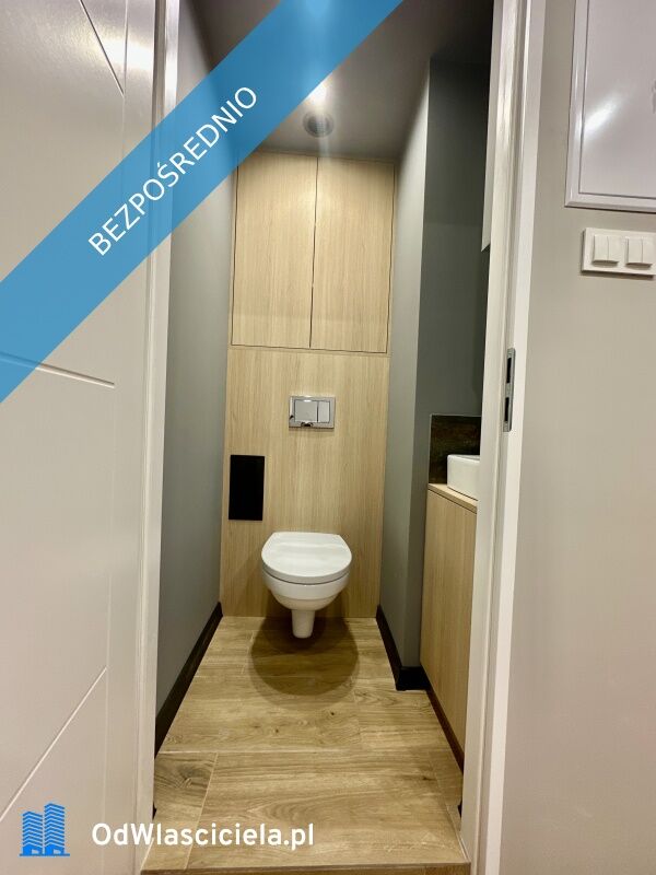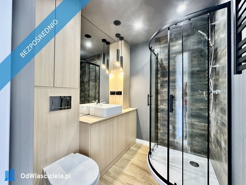 Łazienka z WC – wyposażona w kabinę prysznicową oraz z mablami wykonanymi na wymiar, przygotowane miejsce na pralkę.