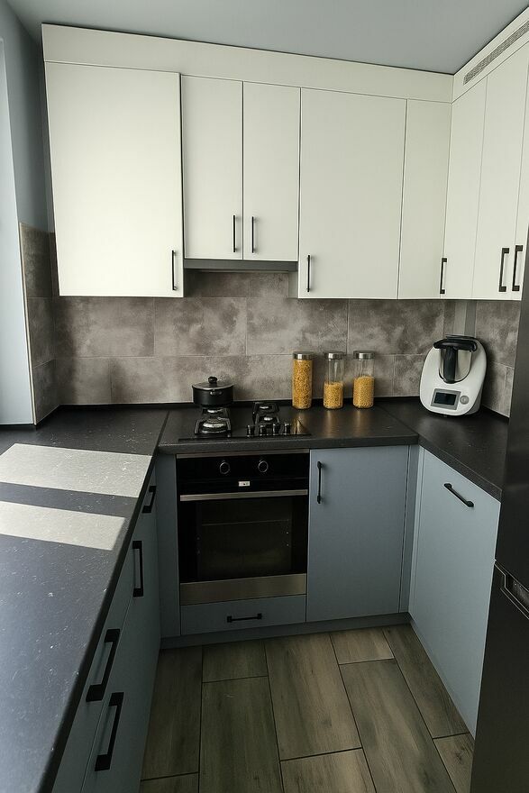 Kuchnia umeblowana, liczne szafki, piekarnik elektryczny, płyta gazowa, zmywarka.