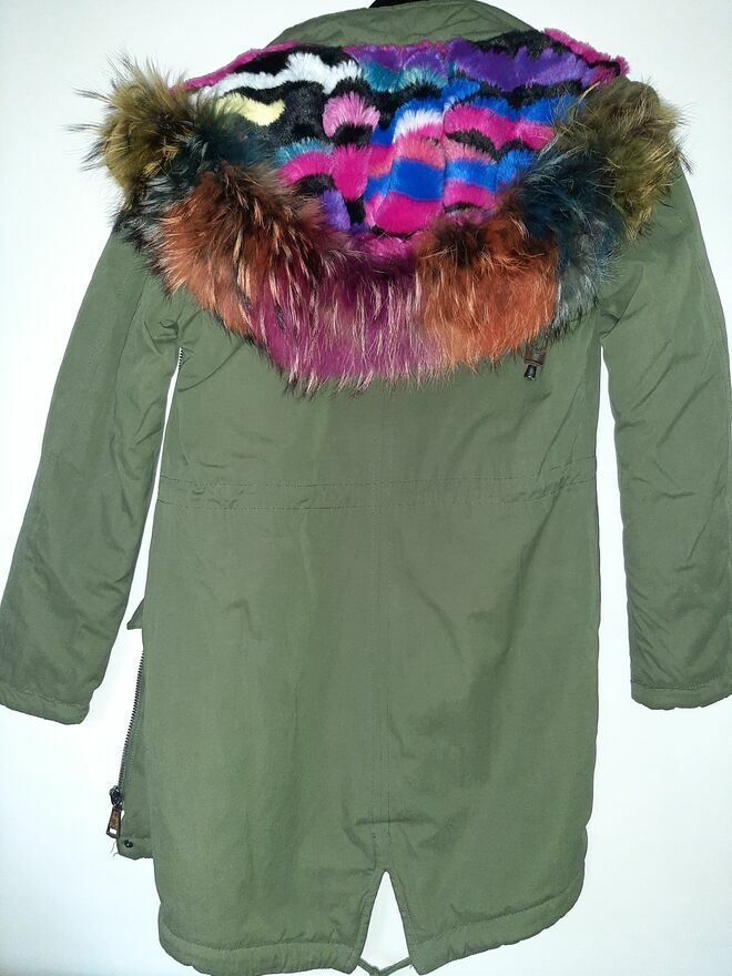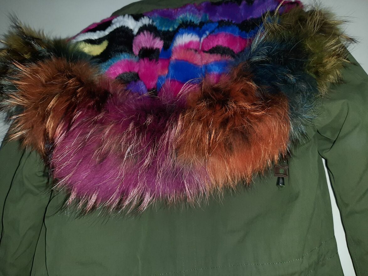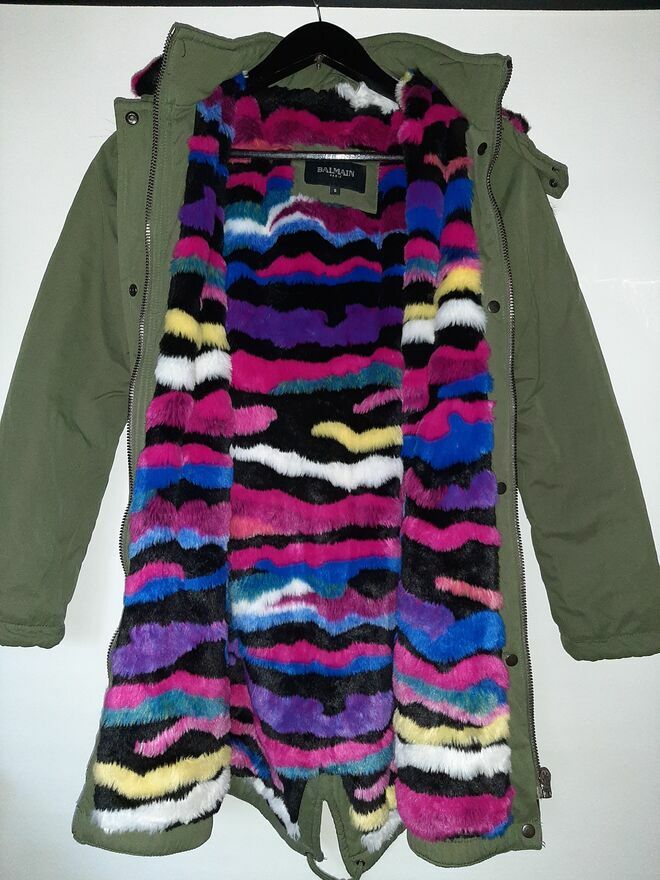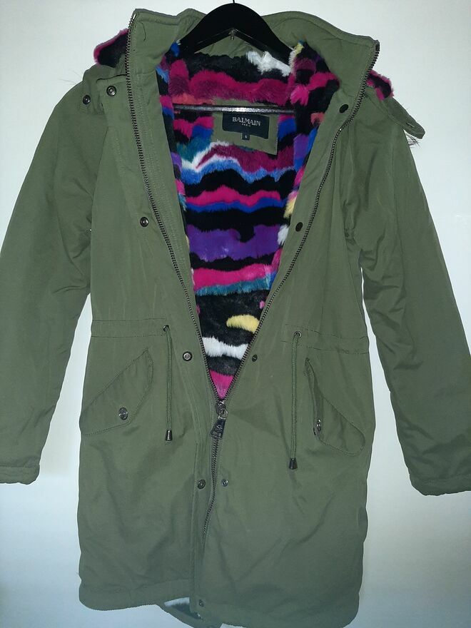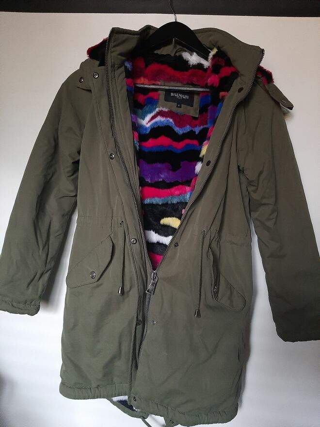 Odbiór wyłącznie osobisty w Sosnowcu!BALMAIN Paris parka z naturalnym obszyciem z jenota (farbowanym na kolorowo). Wymiary kurtki w wiadomosci prywatnej. Z metki rozmiar S. Zapraszam :)