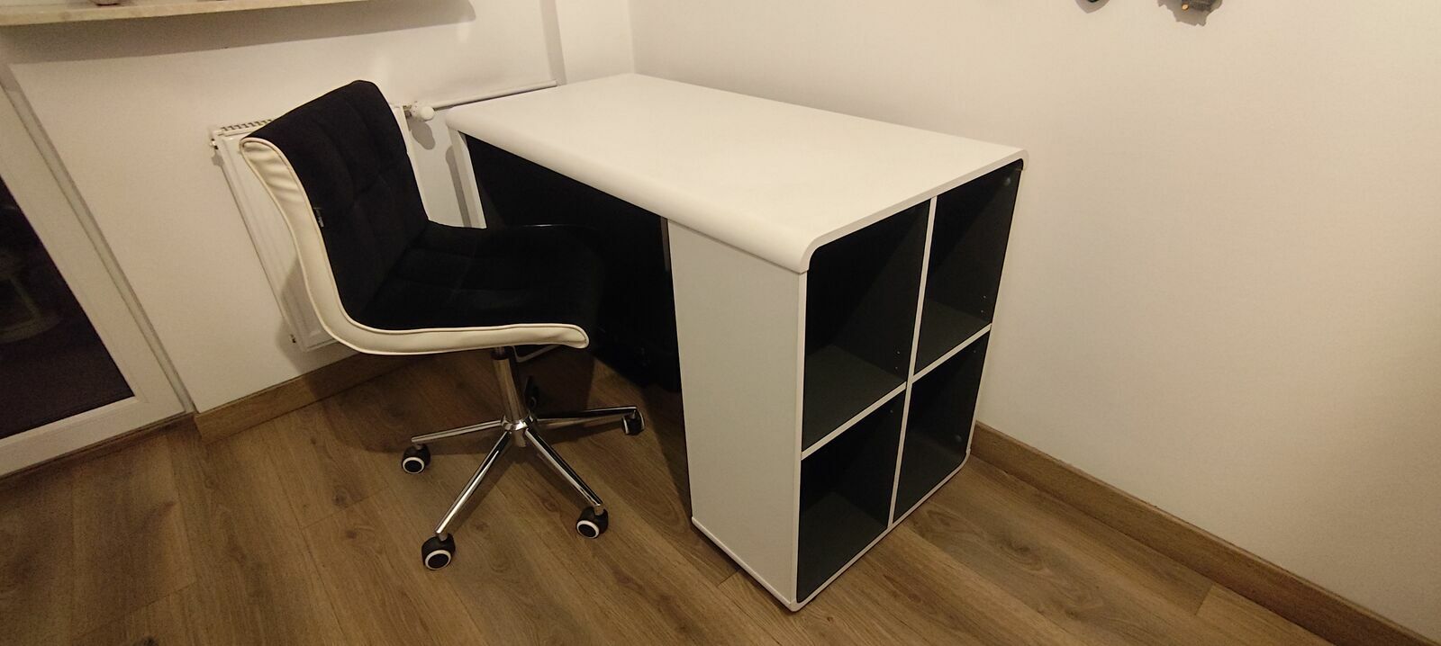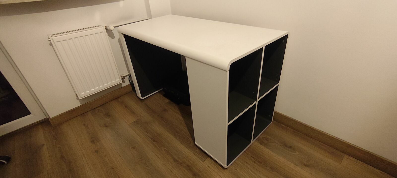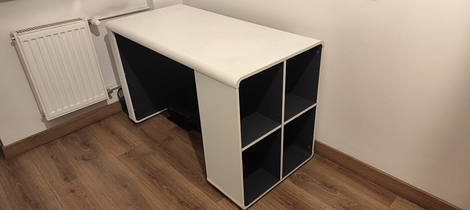 Sprzedam nowoczesne biurko z płyty MDF z 4 otwartymi półkami z boku zapewnia dodatkową dekorację i miejsce do przechowywania. Blat biały matowy a przegródki od strony wewnętrznej w kolorze antracytowym. Wymiary dł.x wys.x szer. 119x76x59. Biurko jest używane w bardzo dobrym stanie. Na innym ogłoszeniu do sprzedania fotel biurowy widoczny na zdjęciu.Polecam