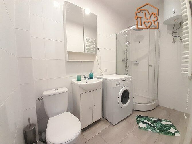 Łazienka: pralka, kabina prysznicowa, umywalka