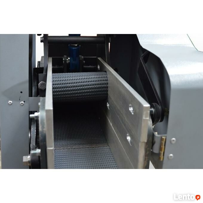 Maszyna uzbrojona jest w dwie taśmy szerokości 150 mm, które w sposób niezawodny prasują podawany materiał. Taśma transportowa zamontowana jest na całej długości maszyny dzięki czemu nie trzeba ręcznie popychać materiału. Do napędu taśm zastosowaliśmy wysokiej jakości koła zębate (brak łańcucha – sprawia utrzymanie stałej siły zgniotu).