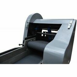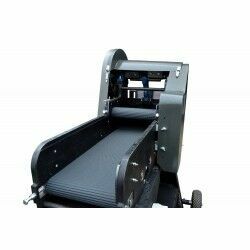 Maszyna uzbrojona jest w dwie taśmy szerokości 300 mm, które w sposób niezawodny prasują podawany materiał. Taśma transportowa zamontowana jest na całej długości maszyny dzięki czemu nie trzeba ręcznie popychać materiału. Do napędu taśm zastosowaliśmy wysokiej jakości koła zębate (brak łańcucha – sprawia utrzymanie stałej siły zgniotu).