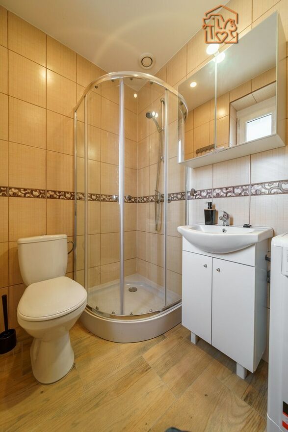Łazienka z WC: panel prysznicowy , umywalka, pralka