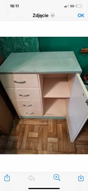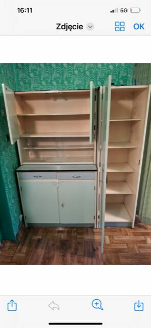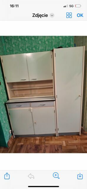 Sprzedam stary, bardzo funkcjonalny, solidny kredens kuchenny z przystawką z okresu PRL (lata 60-te) w kolorze seledyn, krem z dodatkami popielu (siwego).Kredens składa się z kilku elementów : dolna część : komoda z zamykanymi drzwiczkami i 2 szufladami , w górnej części kredens wyposażony jest w półkę zamykaną przesuwanymi szybkami oraz otwieraną szafkę.