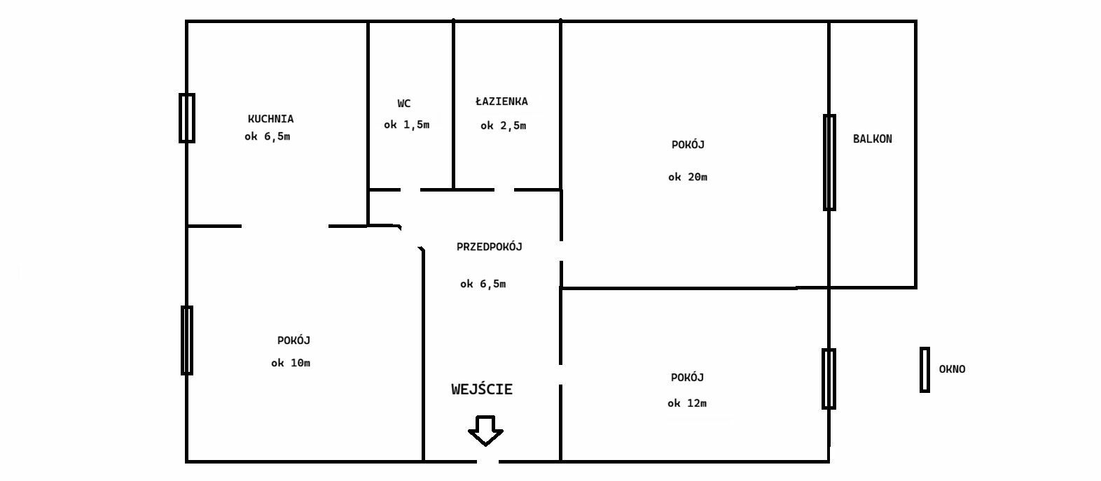 Układ pomieszczeń: 3 pokoje, widna kuchnia, łazienka, WC