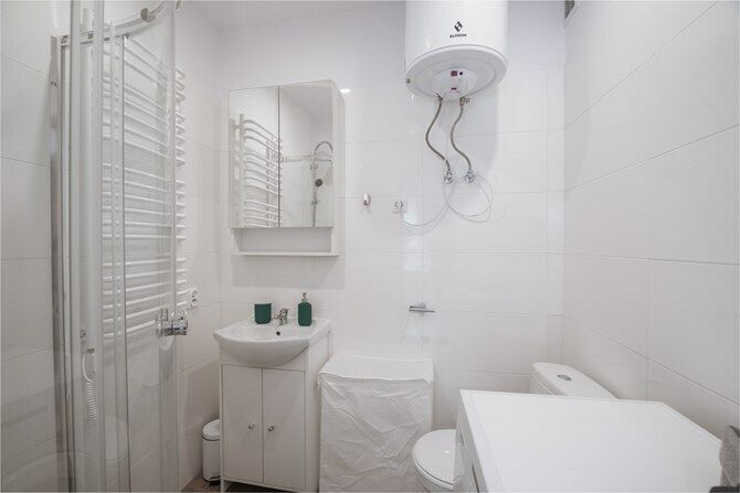 Łazienka: pralka, kabina prysznicowa, umywalka.