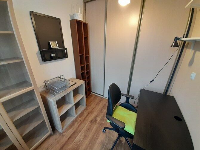 Pokój nr 3: szafa w zabudowie, biurko z krzesłem, regał.