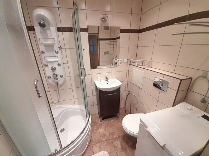 Łazienka z WC: kabina prysznicowa, umywalka, szafka, lustro, pralka.