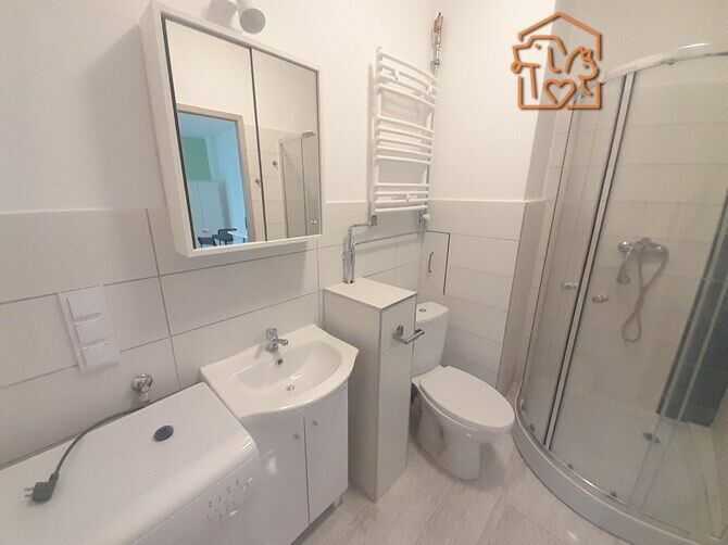 Łazienka z WC: szafka, lustro, kabina prysznicowa