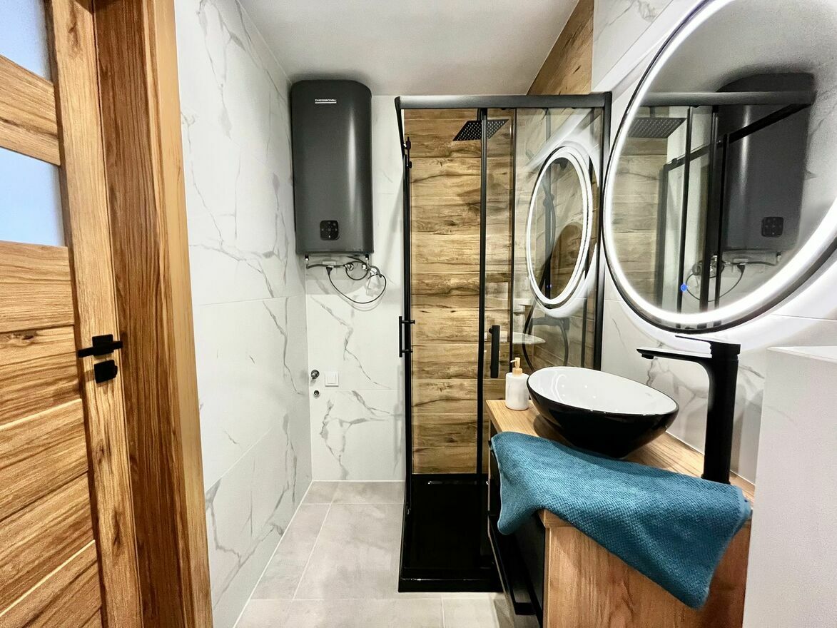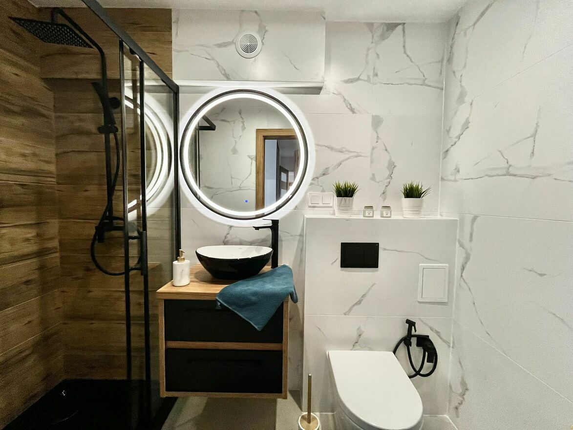 - Łazienka z WC i prysznicem, w nowej aranżacji,