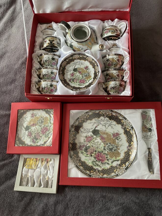 Yamasen Japońska porcelana z 24-karatowym złotem Zestaw Japońska porcelana Yamasen zestaw 15 elementów 6 szt. Talerzyków deserowych Talerzyk na ciasto ze szpatułką 6 szt. łyżeczek Nowe 29 szt. Nowe, nieużywane Pudełka są lekko uszkodzone Tylko odbiór osobistySprawdź zainteresowanie tym ogłoszeniem